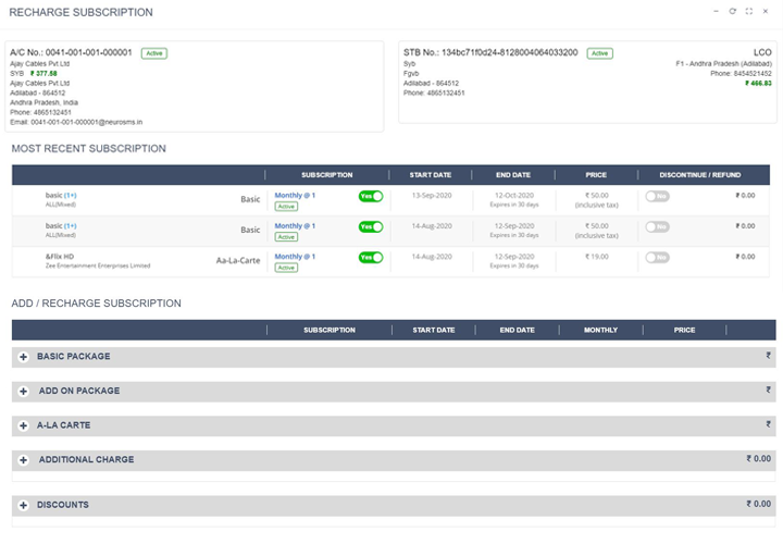 Neuro SMS provides integrated Pay TV Billing Solution to handle billing tasks of any scale or complexity. Pre-paid, post-paid, Package, a-la-carte, pay-per-view, Video on Demand (VoD) etc. The system keeps record of all Billing cycles of all subscribers as per Term (monthly, bi-monthly, quarterly, half-yearly, yearly etc.) defined in subscriber management portion.